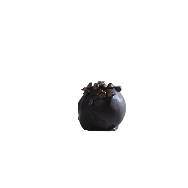 Dark ganache with grilled hazelnut praline coated in dark chocolate rolled in cacao.